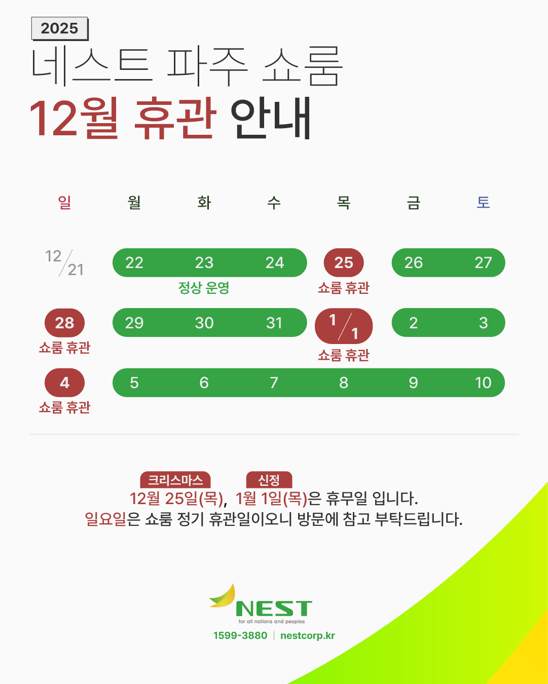 네스트 파주 전시장의 12월 및 1월 중순까지의 운영 일정표
