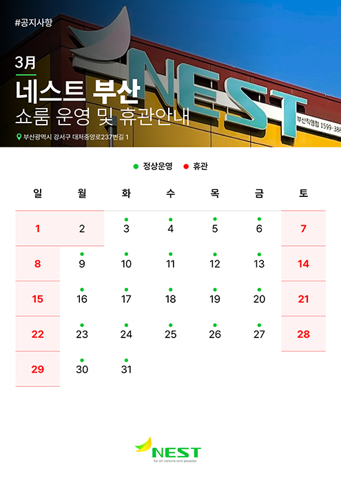 네스트 부산 전시장의 2026년 3월 운영 일정표입니다.