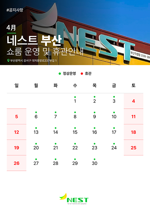 네스트 부산 전시장의 2026년 4월 운영 일정표입니다.